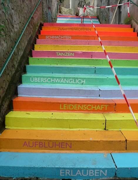 The Holsteiner Stairs in Wuppertal, Germany have been renamed in the general public as the Rainbow Stairs for obvious reasons. German artist Horst Glasker painted the steps with acylic paint, which he then titled Scala, the Italian word for staircase. Each stair got its own color, creating the rainbow through the city that residents and tourists are so familiar with. The 112 steps each have a German word representing human relationships and emotions stenciled on them. The ranged from honor and innocence to rage and prohibition. These stairs have become viral, inspiring the steps in #1 painted by the Dihzahyners.