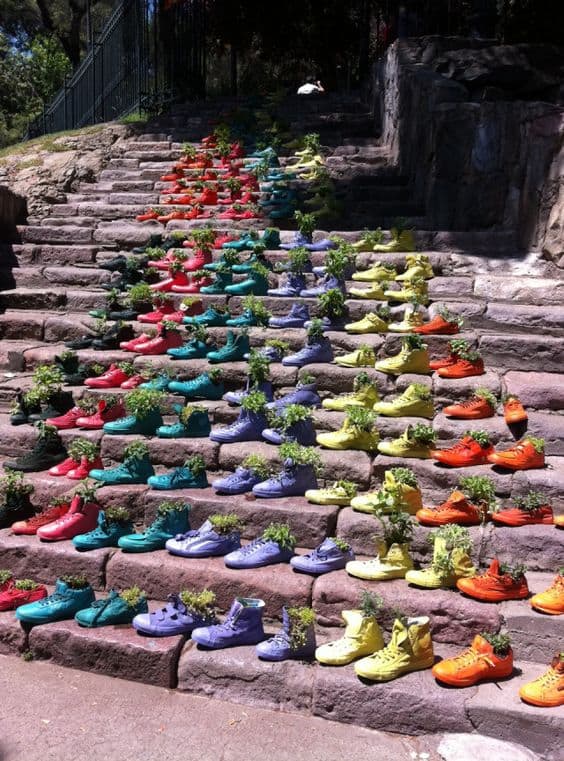 This stair features another odd use of materials in the name of street art. LEV, Laboratorio Escenico Visual, partnered with Converse to create this installation. LEV works to create thought-provoking arts installations in cities that interact with the city itself. By partnering with the shoe designer, they created different pairs of rainbow sneakers that were then used as planters. They staggered them across the steps at the exit of a park in downtown Santiago. These brightly colored shoes bring life and color to an otherwise dull stone staircase.