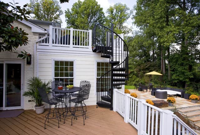 This first deck design idea features a spiral stair that connects several decks. Multi level deck designs are great for homes that are looking to make the most of their outdoor space without building out. Each level of the deck gains a level of protection from the elements, allowing the homeowner to enjoy their decks during any season. This particular stair is an aluminum powder coated spiral stair. The naturally rust prohibitive spiral stair is finished with a powder coating process that gives the stair a maintenance free barrier. The homeowner chose to add matching deck railing and diamond plate treads for added safety in all weather conditions. By keeping the width of the stair small, they were able to make the most of all three levels to their deck.