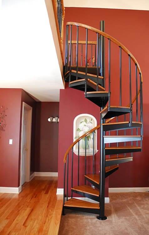 A happy medium between the stability of a traditional staircase and the small footprint of a ladder is a spiral staircase. Spiral stairs feature full steps and a structurally sound frame without the large rectangular footprint of a traditional stair. The spiral design means that the stair builds on top of itself and keeps the footprint to a small circle in your floorplan. A spiral stair design is highly customizable with three different product lines at the base: Classic Steel, Forged Iron, and All Wood. Classic Steel spiral stairs often feature simple designs that complement existing spaces. Forged Iron spiral stairs are known for their ornate details in the spindles and handrail caps. Both of these metal frames can be paired with wood treads and handrails to create a classic library design. The All Wood spiral stair is a great option for those looking for a truly traditional library design. We have a wide range of wood species available to fit your home library design.