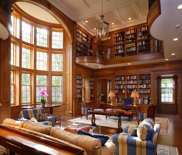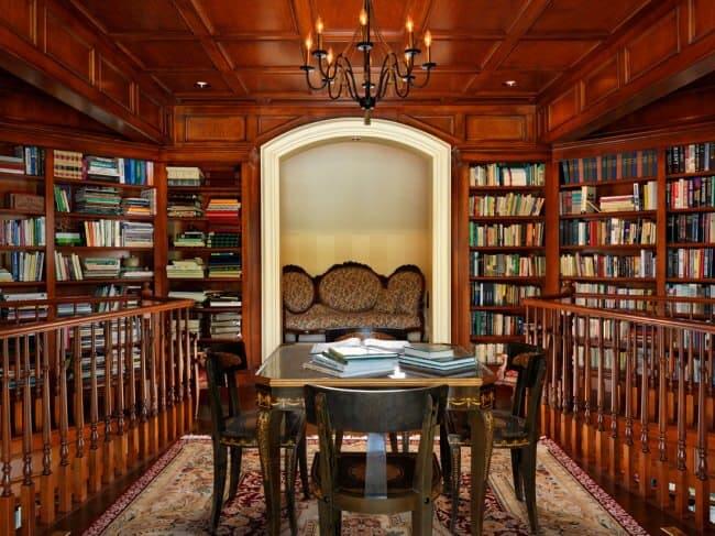 The addition of a large wooden desk can also take you’re your library design to the next level. Match the wood tones to the ones you’ve used in your wall panels and bookshelves to create a cohesive design that takes you into a classic den design.