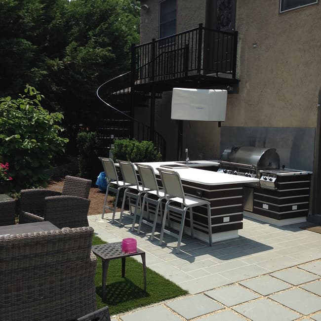 Lighting is a very important part of any outdoor kitchen. You’ll want bright lights that allow for clear visibility at night. This is important for safety reasons around a hot grill and potentially sharp knives. If you decide to separate your kitchen and dining area with a multi level deck design, as many homeowners do, you can have more aesthetically pleasing lights in other areas. Café lights are a very popular design option for dining areas. Café lights are a mix of trendy Edison bulbs and string lights. They are a little dimmer than the bright task lights of the kitchen area, but still fill the space with mood lighting. It adds a finishing touch to your outdoor dining area.