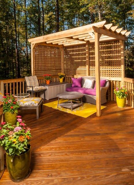 Pergolas are a type of awning that are usually found in gardens and are made from all wood designs. They can be large enough that they extend out from the house and shade your entire deck, or small enough to cover one corner. The basic design of a pergola has an open roof that can support climbing plants and vines. This is one way to incorporate green space into your deck while still having the shaded protection you’re looking for. If you want more coverage, you can add a lattice wall to the outside of your pergola. Incorporate your climbing plants into the lattice panels to create a privacy screen for your deck. If you don’t have as much of a green thumb, you can attach curtains to the lateral beams that make up the open roof of your pergola. This can give you protection from direct sunlight and is an easy DIY project for any homeowner.