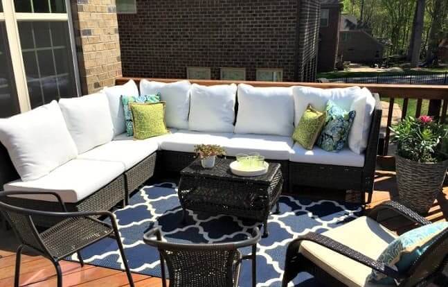 Design accents can help finish out your outdoor living room design. Outdoor rugs are another indoor element that is making their way outdoors. Some may think they’re durable fabrics make the designs bulky and unattractive. However, there is a wide range of designs available to fit your space. If you can’t find your dream rug in your budget, you can always paint one! Just like creating your own textile for the cushions, you can paint a plain outdoor rug to fit into your space.