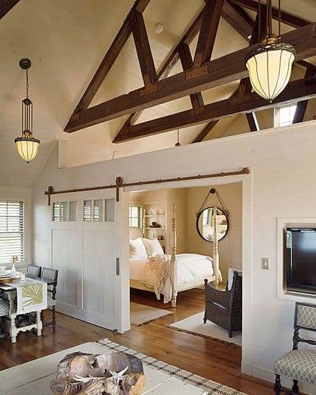 Another traditional choice are the wooden barn doors that lead into the living room. These are the rustic answer to classic French doors. They can be opened for maximum light and air flow without taking up any extra space.