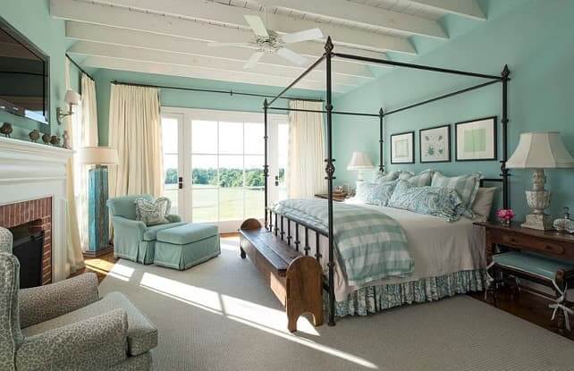 Just because you’re living in a barndominium doesn’t mean you have to have wood panel walls. These solid color walls are painted a tranquil teal color to support feelings of relaxation and serenity in the bedroom. These aren’t the vaulted ceilings that we’re used to seeing thus far in barndominiums, but they do have exposed support beams. Because the beams hang lower than the ceiling, it’s easy for the room to feel cramped. The homeowner avoided this all together by painting the ceiling and beams white to make it feel brighter. The bright ceiling paired with the wall of windows allows the reflection of natural light all throughout the room. The décor accents are kept minimal and a fireplace is the focal point on the far wall.